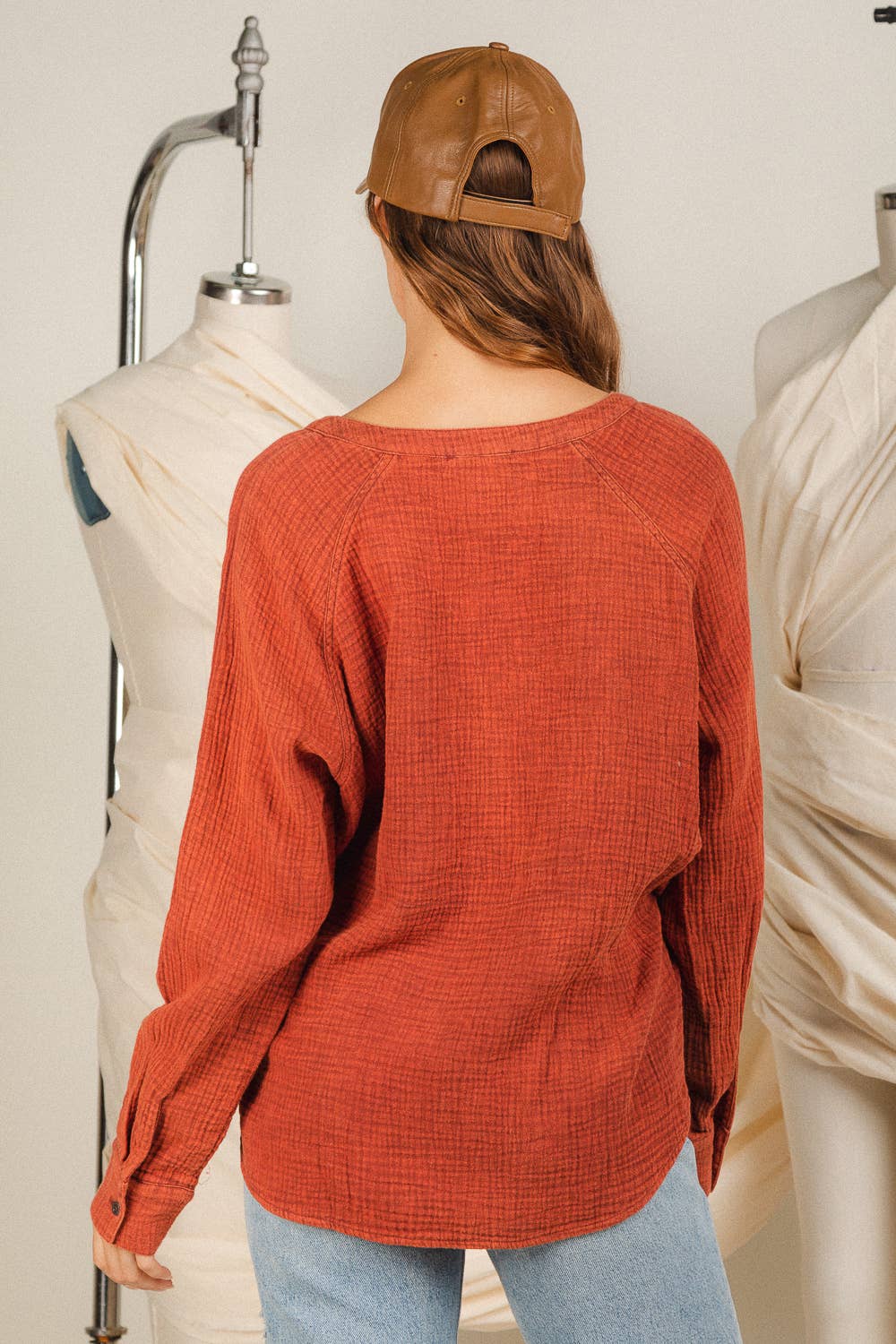 **The color of washed products may look different from the pictures** - Solid washed wrapped shirt - Long sleeve - Snap button closure - V-neck (Model height: 5'9", wearing a Small)